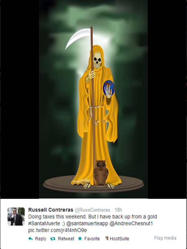 The note at the beginning of the prayer in English regarding substituting a picture as an object of devotional focus speaks to the utility which makes Santa Muerte so appealing to those seeking help in times of great need. It also shows the care that devotees feel Santa Muerte shows to those who seek her in true faith with a humble ‘heart and soul,’ no matter what means they use to approach her. AP Reporter, Russ Contreras, mentioned on Twitter that he’s using a digital development that takes advantage of this, the Santa Muerte Altar App, which creates instant altars for your iPhone: