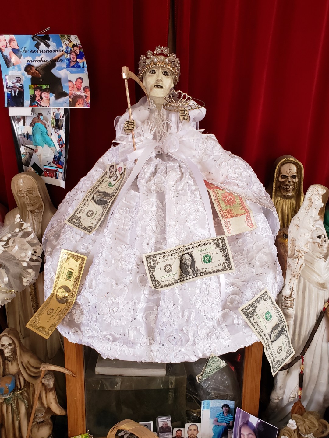 Up the hill at the diminutive Santa Muerte chapel what most caught my eye was the unusual depiction of the Skeleton Saint. Its fleshy, mummy-like face is very similar to two other of the oldest images of the Mexican saint of death, the effigy of Tepatepec, Hidalgo, which was created as a likeness of Saint Bernard Clarivaux, and Doña Sebastiana of New Mexico and Colorado.