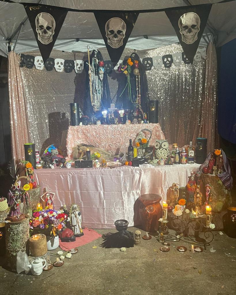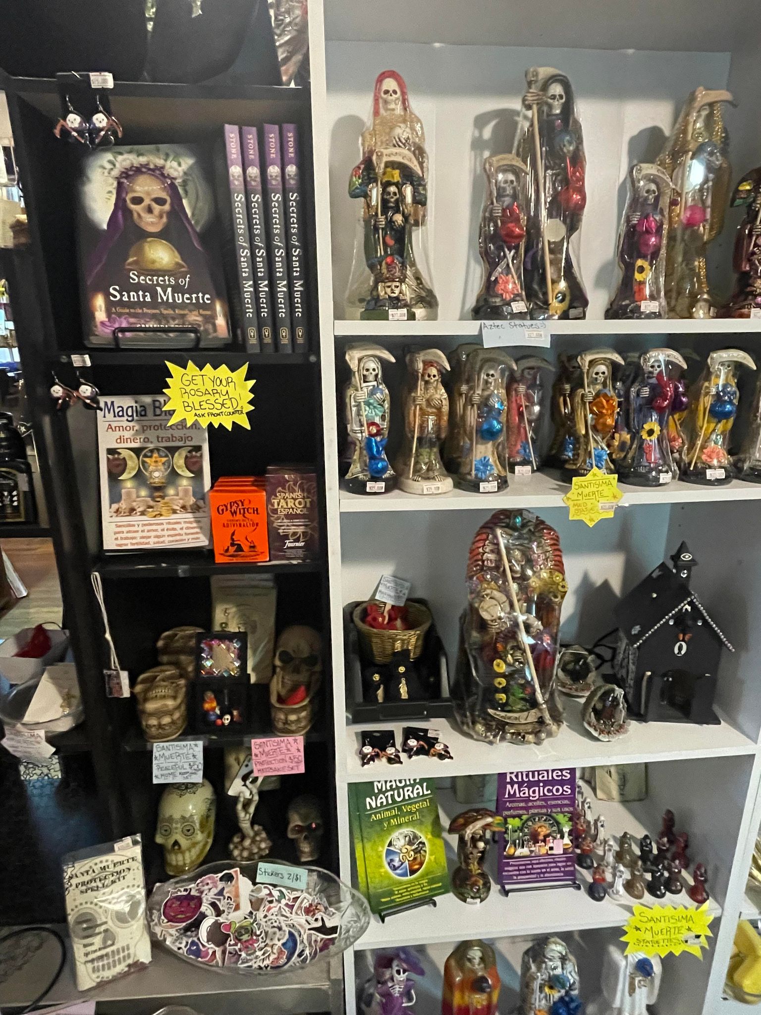 The following article is an amended transcript of an interview by Doctor of anthropology Kate Kingsbury with Mexican-American, Chichimeca & Karankawa, Santa Muerte devotee Mariposa Yetzirah, who is co-owner of Absolem’s Midtown Mojo Manufacturers located in Houston. The shop has a public altar to Santa Muerte where devotees come to pray in ever increasing number, and sells Santa Muerte statues and other magical items (see below).
