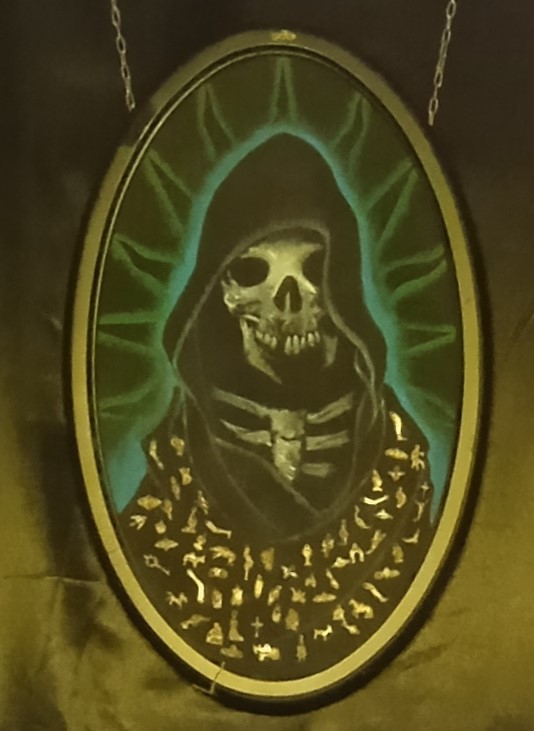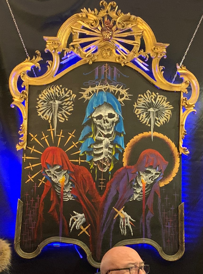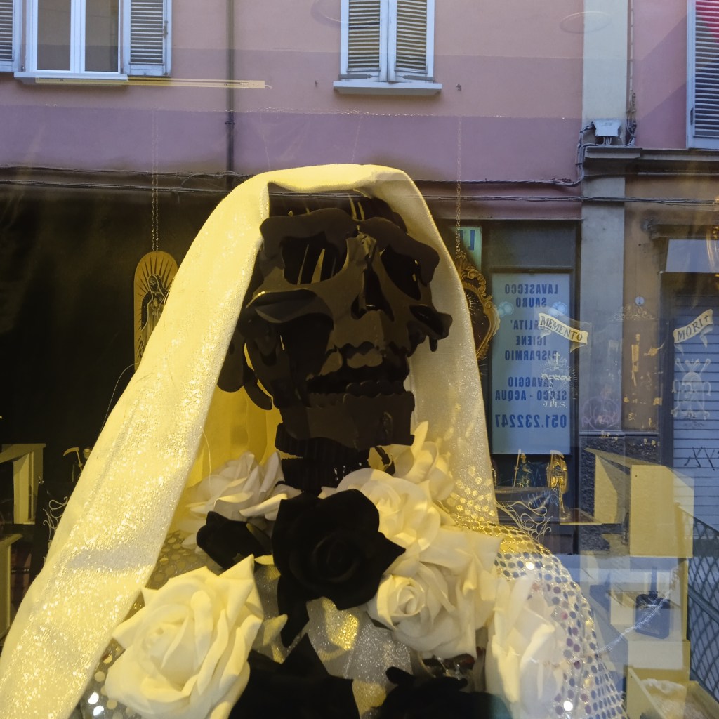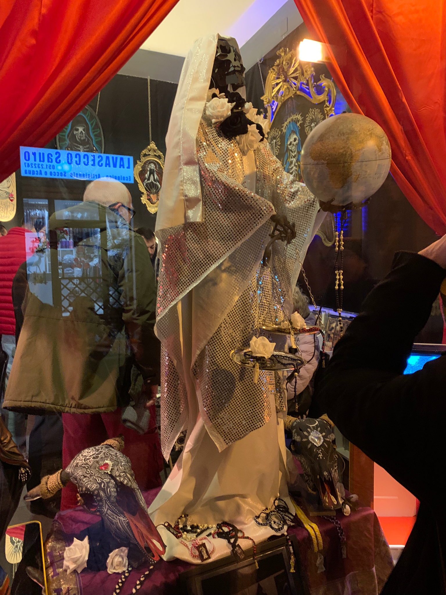 But this time in Bologna we found ourselves in front of an art exhibit that recalled a true devotional chapel with a life-size Niña Blanca holding a globe in one hand and the scales of justice in the other, at her feet two decorated ox skulls and various rosaries and scapulars, all beautifully illuminated with flowers and lights of various colors. The image is made of iron, covered with white and decorated drapes. Red and white fabrics form a canopy that descends to the base, just like a real altar. It was created by the Bolognese artist Diego Borghi who has participated in various exhibitions and draws inspiration from the imagery of alternative musical cultures and subcultures with a penchant for the esoteric mystical genre and also draws from the world of horror comics.