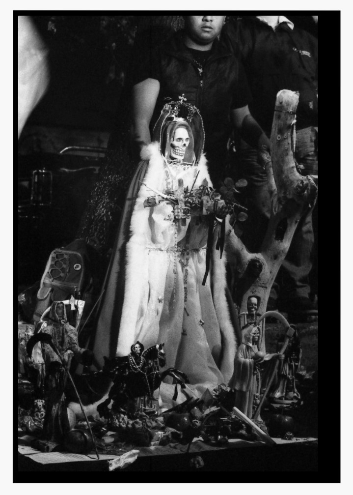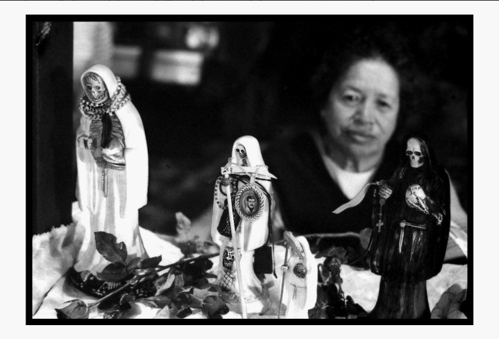 I asked Diego if this exhibit is more of a devotional act or “just” an artistic performance and his answer was that he does not consider himself a true devotee but has great respect for Santa Muerte and other cults. However he is tremendously fascinated by the saint and the myriad representations of death. He has visited various shrines in Mexico and saw the great participation and faith of the devotees, wanting to pay homage to the saint. Larry, of Gallery 16, which hosted the event, and Lara (owner of an exhibited statue) are fascinated by the majesty of the saint and are happy about the number of visitors who have paid homage to her and who have visited the exhibit of a selection of the works of the Mexican photographer Miguel Zuniga Ruiz, who trained alongside important artists in various workshops, participating in various group exhibitions.