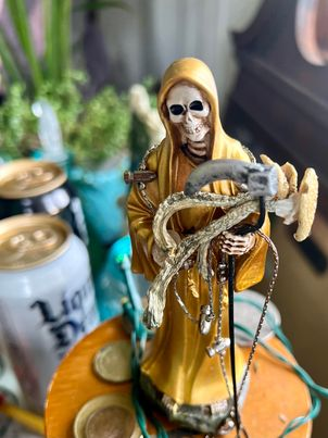 I also give mushrooms most of the credit for leading me to Santa Muerte. The first real experience I had with La Santísima was after consuming some fruits I grew. It was a full moon actually, though I didn’t think much of that (and still don’t know if I do), just noteworthy… actually I think it was the 9th, too. I took was my usual dose, which is high compared to some and not recommended for beginners, of between 4-5.5g lemon tek. I had purchased some of her candles at the local grocery store on a whim — kind of as protection because I grow them, though I was not a devotee at the time. I had those lit and I felt like she became present and was telling me what she wanted me to do for her, and in exchange she would help me win the money I needed to pay the rent (we have been struggling financially for a while, husband is a professor but has been home with the kids for a few years and having a hard time getting a university position, I was a manager and made good money but had to resign a year ago due to exhaustion from work and long Covid).