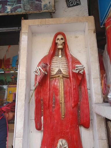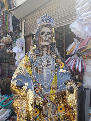 I wandered around the square looking for likely signs. As not everyone approves of Santa Muerte worship, I decided against asking a local for help and instead gave it up as a bad job. I was about to leave but then I spotted some Santa Muerte statues for sale in a shop so I thought well I can ask them. If they sell her statues they can’t object to my asking where the Church is. They indicated with gestures that I was to walk to the end of the shop and I then saw that the Church is actually located at the back of the shop. I followed the same process, lit my candle, got tearful, said my prayers and bought some stuff.