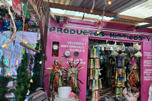 Next stop, San Cristobal, Chiapas ,l and praise Heaven and all their Angels. The temperature drops and it starts to rain, much more comfortable for a person who is from a country that rarely gets over 20 degrees. While there were no Santa Muerte shrines that I could find in the town centre there is clearly a lot of magick going on. Evidenced by the number of signs I saw offering tarot readings, the presence of herbal and complementary therapies plus the two botanics by the municipal market. One of the two botanics carries mostly herbs with a few products related to Santa Muerte with extremely friendly staff. The second botanica, which is a very pretty pink botanica, carried a lot of Santa Muerte products. I was in the shop for quite some time and some of the other customers had Santa Muerte tattoos and pendants so clearly devotees.