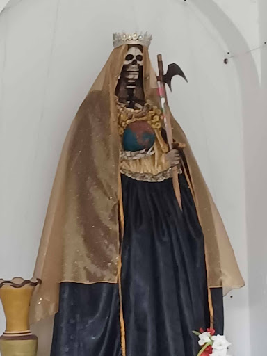 I decided to visit one of her shrines the next day on November 2nd. There are a number of shrines for Santa Muerte in the outlying areas of Merida so I popped in a cab to the Santa Muerte mi Reina Hermosa S.M.I as soon as the cab driver stopped I knew where the chapel was due to the large image of Santa Muerte over the doorway. At this point my signal on my phone had failed me which made communication difficult. The women who looked after the shrine were extremely friendly and I did understand that they had a fiesta the previous night. They were showing me the enormous amounts of lit candles at the chapel that had been placed there the night before. This was an extremely pretty chapel and I was again overcome with emotion and was very reluctant to leave.