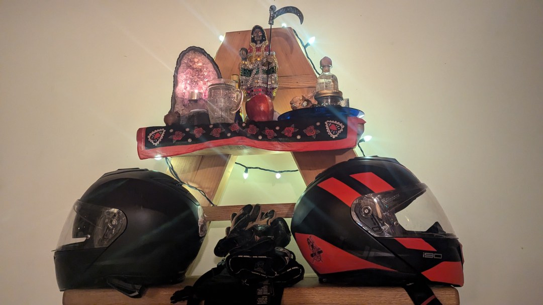 While the statue on my altar is the Siete Potencias version, I talk with La Reversible on the road to deflect the attention of radar detectors etc and protect from accidents.