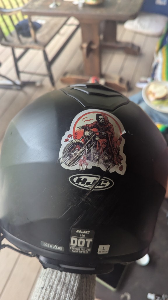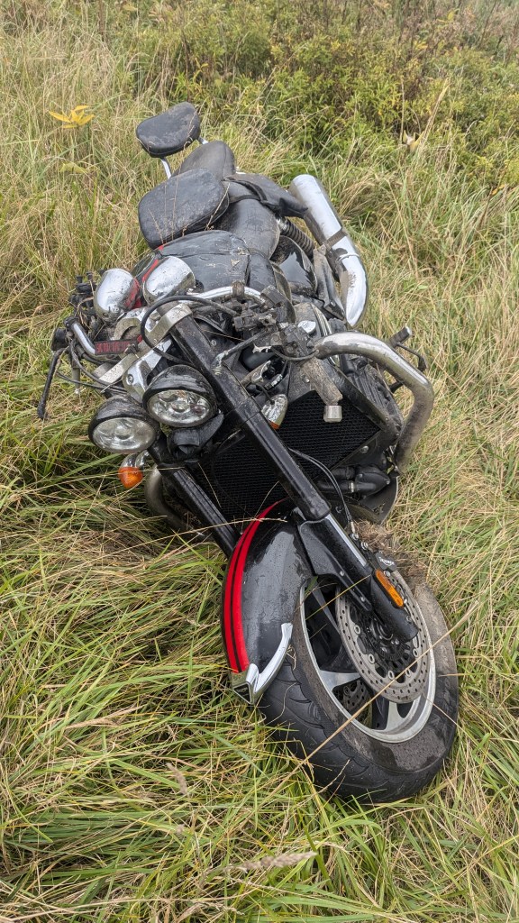Meanwhile the bike crossed two lanes of interstate traffic without causing any further accidents (to be fair, traffic was quite light), and landed 100+ feet into the median strip. Judging by the damage it sustained to its top side I think it flipped over on its final journey (if you zoom in on the picture of the crashed bike, you can also see the “But Did You Die?” keychain hanging upside down, also in Reversible colors!) Most people can’t say they stood up and walked away immediately after a 90 mph motorcycle crash, but we both did. I got a bit of road rash and bruised hips, and my husband’s shoulder is a bit sore, but that’s it. So it’s enough of a miracle to be walking and talking, but there are a couple other odd bits to the story.