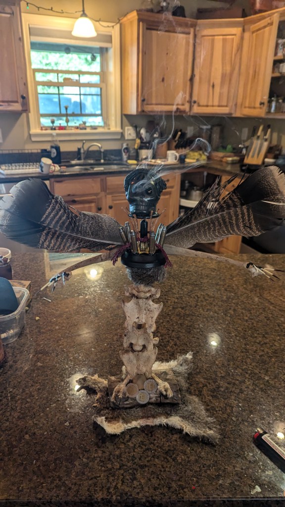 I feel like I should add that this piece, like many of my artworks, uses parts from a number of animals – squirrel skin, wild turkey feathers, cat ribs, owl talons, porcupine quills, and various deer bones (as well as driftwood, a barro negro skull, and .38 special rounds, with a candle holder so that the head lights up from within). All the animal parts I use are collected without harming animals for the purpose: they are forest/roadkill finds, or from animals harvested for food by my husband or my son. The cat was our own pet, who had to be euthanized at the age of eighteen. I cover such things in wire mesh and rocks out in the woods to protect them from scavengers, and let the insects do the work of cleaning them. Somewhat macabre maybe, but I’m not a sociopath…